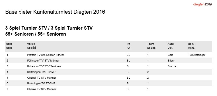 KTF Diegten 2016 vom 4. und 10.Juni 2016 - 3.Rang für Bubendorf im STV 3-Spielturnier der Senioren